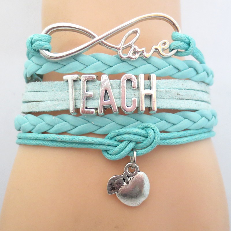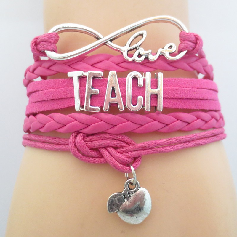 Back to school will be here before you know it! Honor a special teacher in your life with this stunning bracelet. Made in your choice of color, it features a silver infinity "love" charm, the word "Teach", an apple charm, and an adjustable lobster-claw clasp.